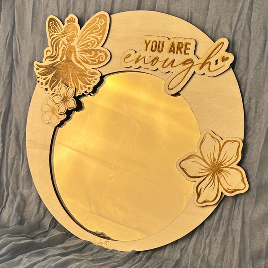 Miroir inspirant en bois « You Are Enough » – Fée & fleurs gravées – Création artisanale