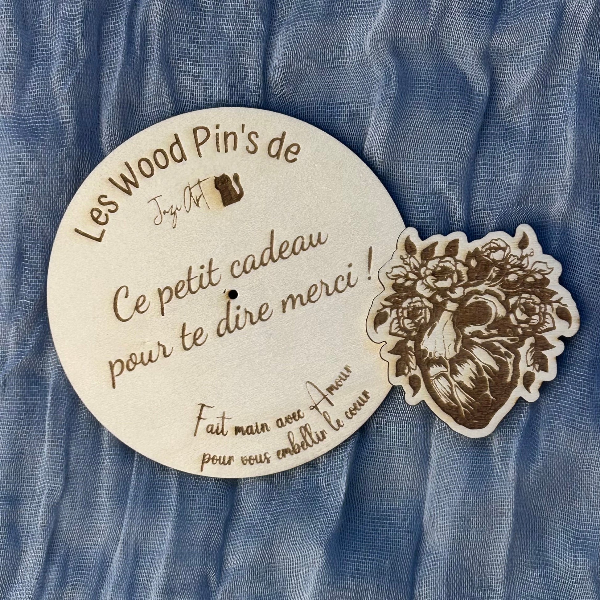 Ce pin’s en bois, gravé au laser, représente un cœur d’anatomie délicatement orné de fleurs, pour symboliser la beauté, la vie et l’émotion.